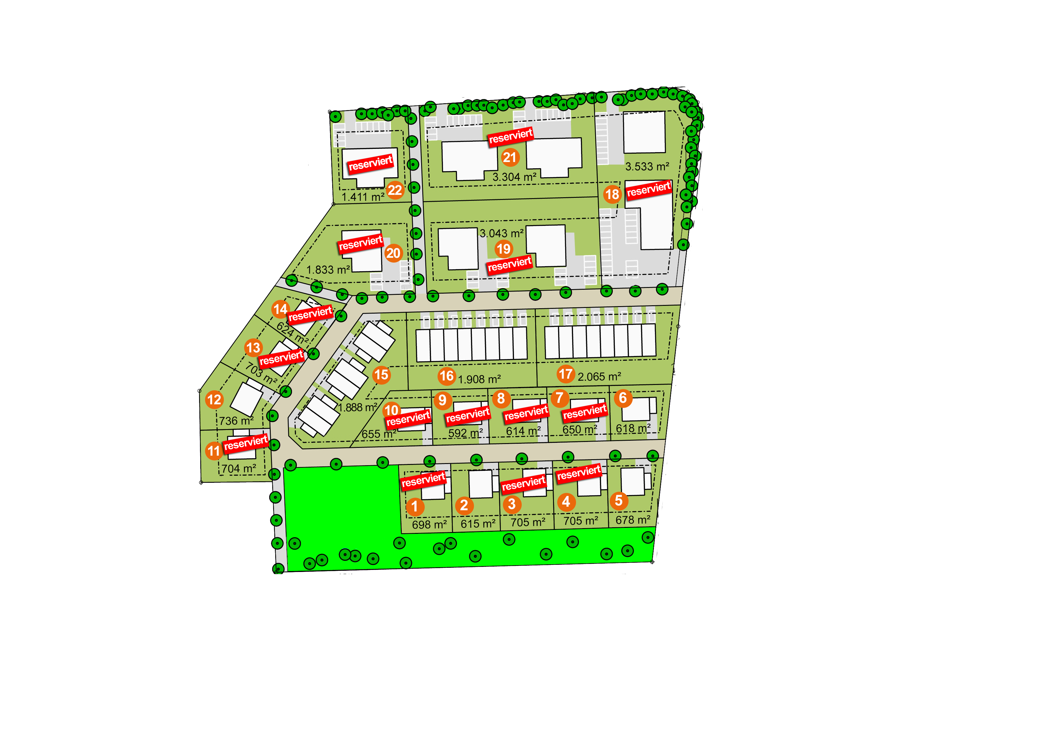 • Die Grundstücke 15, 16 und 17 liegen in dem VB 2 und werden als Gesamtpaket vergeben. Hier können Bauträger oder Investoren Doppel- und Reihenhäuser realisieren.