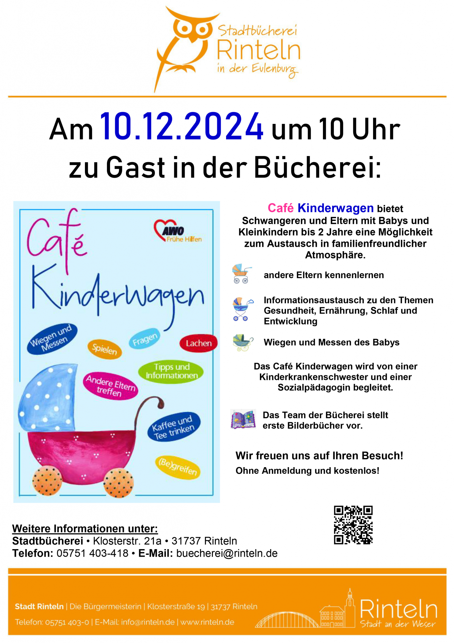 Das Café Kinderwagen der AWO Schaumburg ist am 10.12.2024 von 10 Uhr bis 11:30 Uhr in der Stadtbücherei Rinteln zu Gast.