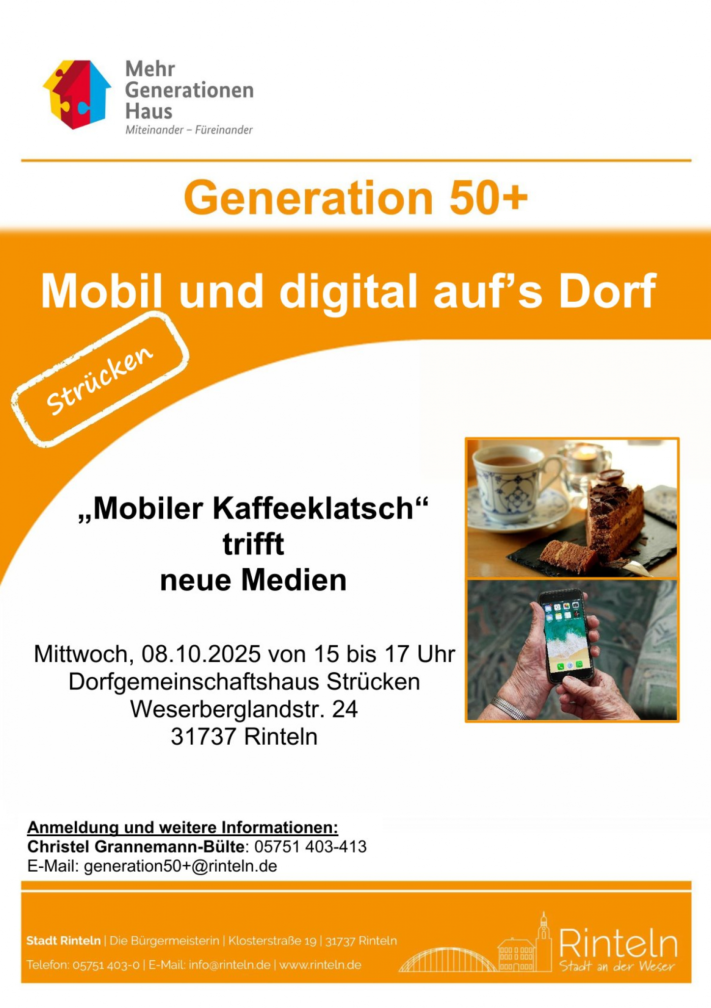 Die „Generation 50+“ freut sich, Sie bei Kaffee und Kuchen begrüßen zu dürfen. Das mobile Angebot findet abwechselnd in den verschiedenen Rintelner Ortsteilen statt, sodass jeder und jede die Möglichkeit bekommt, ohne weiten Anfahrtsweg einen gemütlichen Nachmittag zu verbringen.