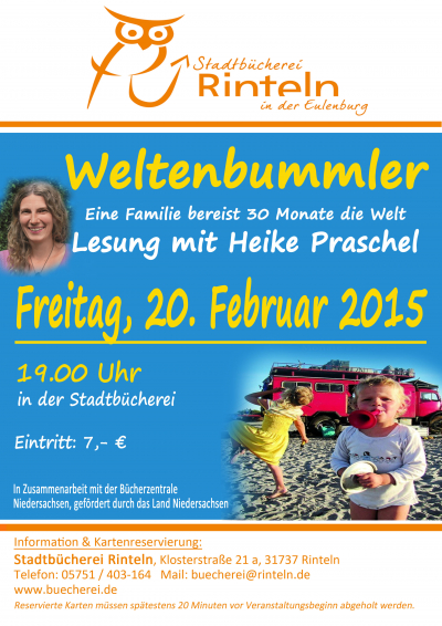 Fernweh? Am Freitag, 20. Februar, veranstaltet die Stadtbücherei Rinteln für alle Abenteurer, Träumer, Neugierige und alle, die vom Langzeitausstieg mit Kindern träumen, einen faszinierenden Abend. Heike Praschel, die im März 2010 mit ihrer Familie von der Oberpfalz in Richtung Mongolei aufbrach, erzählt von ihrem großen Familien-Abenteuer, das 60.000 Kilometer und...