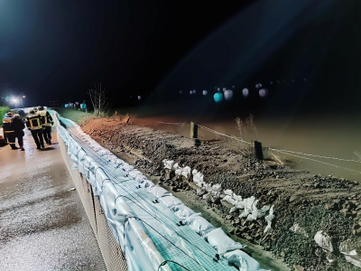 +++Einsatzkräfte sichern in der Nacht Wall mit Hochwasserschutzsystem ab+++
