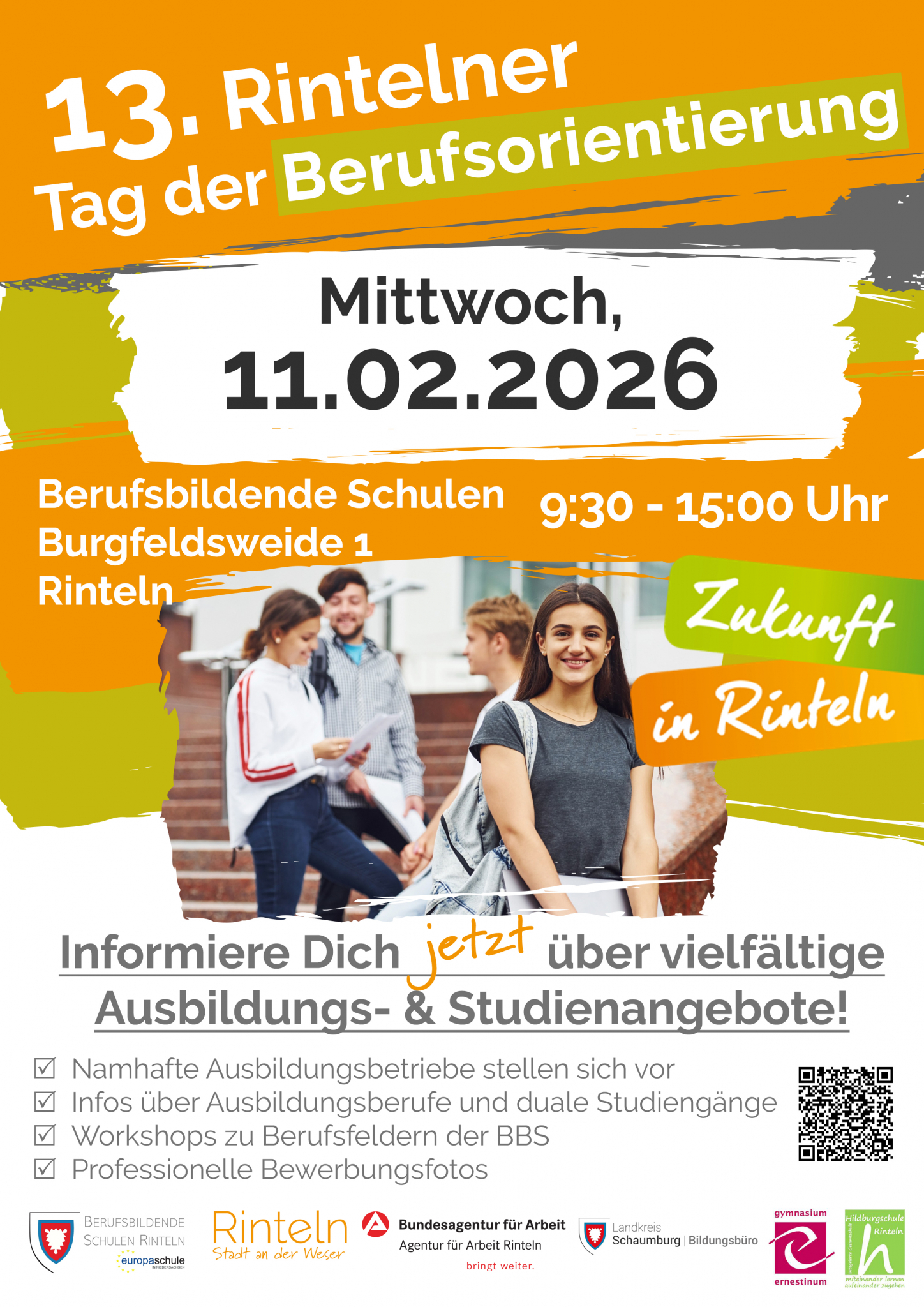 am 11. Februar 2026 findet von 9:30 bis 15 Uhr der "13. Rintelner Tag der Berufsorientierung" in den Räumen der Berufsbildenden Schulen Rinteln, Burgfeldsweide 1, 31737 Rinteln statt. Dieser Tag ist ein ganz besonderer Meilenstein für alle, die sich auf den Weg machen, ihre berufliche Zukunft aktiv zu gestalten. Unsere Region bietet eine Fülle an spannenden Ausbildungs- und Studienmöglichkeiten, die darauf warten, entdeckt zu werden. Ob traditionelle Handwerksberufe, innovative Technologiefelder oder duale Studiengänge – die Vielfalt und Qualität der Angebote unserer lokalen Unternehmen sind beeindruckend. Sie eröffnen unseren Schülerinnen und Schülern zahlreiche Chancen, hier vor Ort einen erfolgreichen Start ins Berufsleben zu finden.